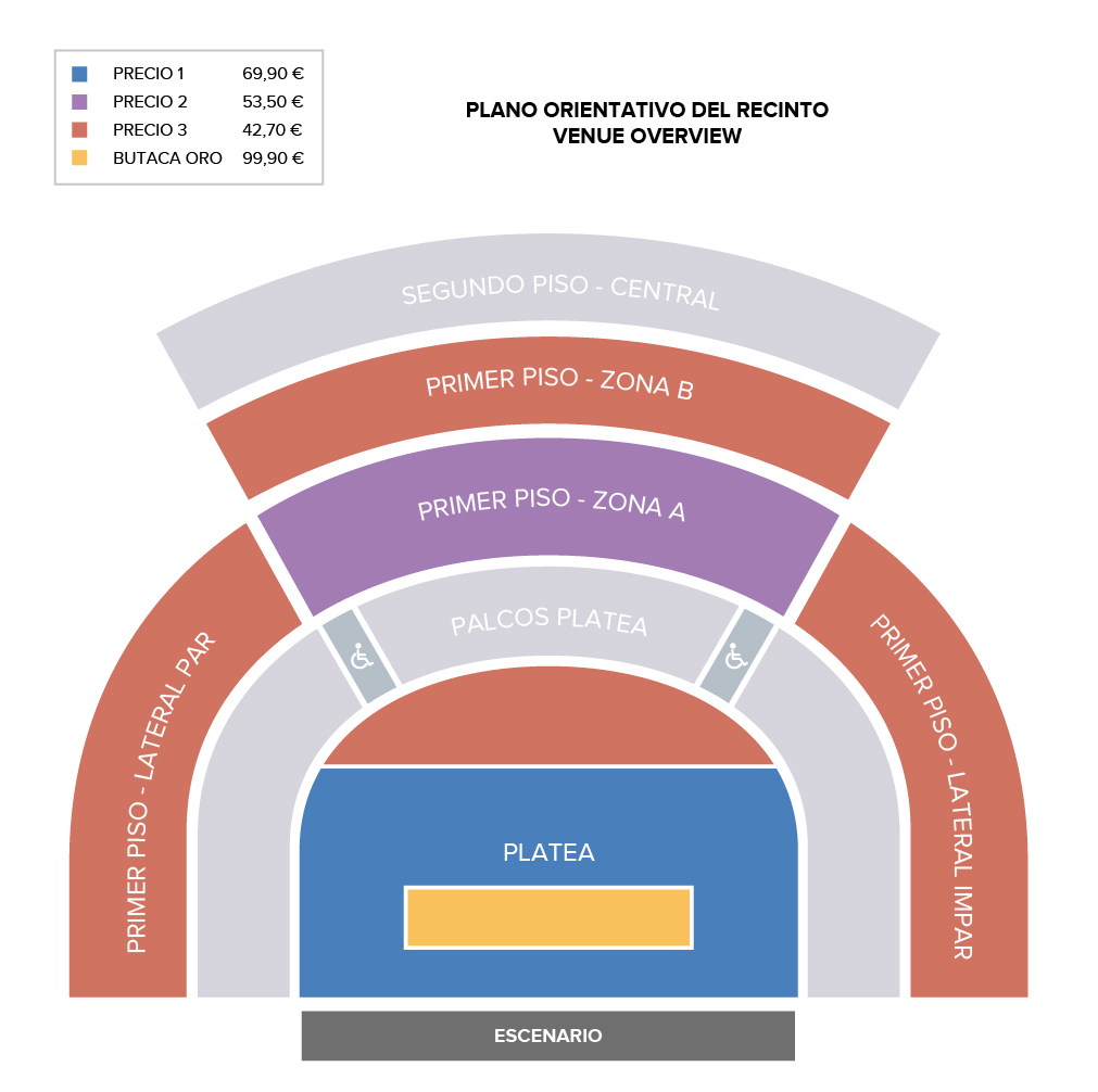 The prices shown include the taxes applicable to the ticket. Additionally, depending on the event and the total amount of the order, a service fee per transaction may apply, the exact amount of which will be itemized before confirming the purchase. Depending on the selected delivery method, delivery fees may also apply.