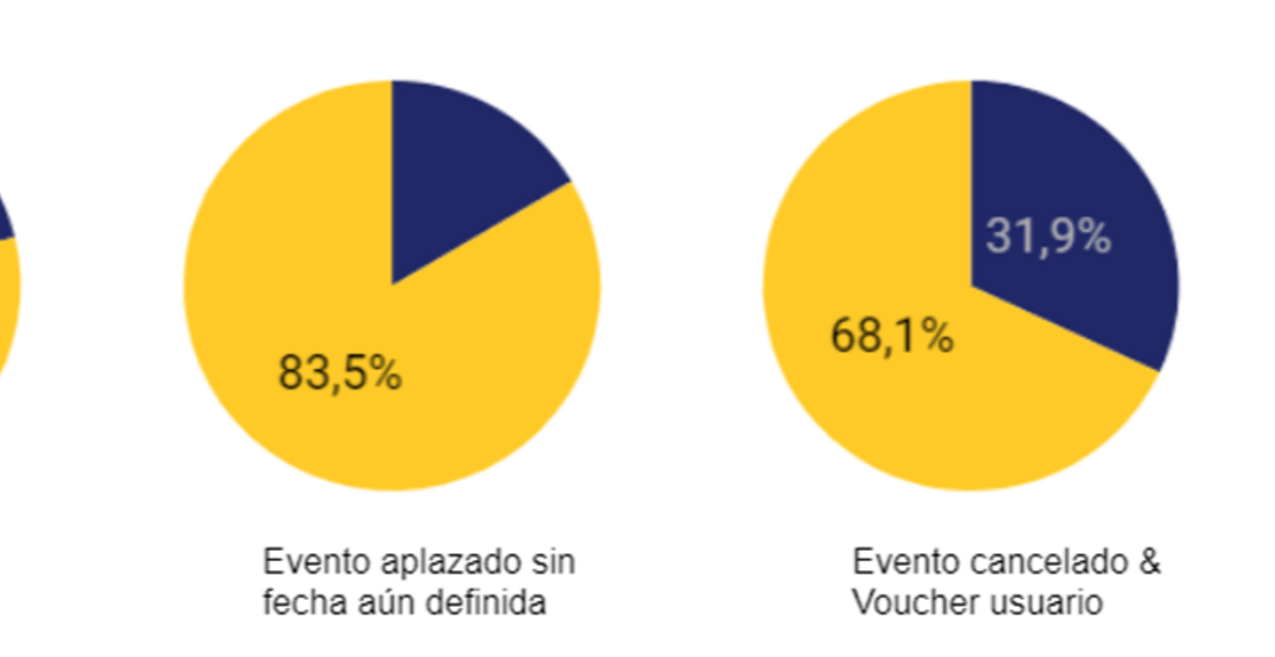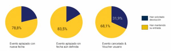 La mejor noticia para el sector es que para los eventos aplazados y en aquellos en los que se ha ofrecido un voucher para utilizar posteriormente, un 77% de los espectadores afectados ha decidido de momento mantener su entrada. El comportamiento de cada usuario varía según la situación de su espectáculo -el porcentaje es mayor en los eventos aplazados que en los que se ha ofrecido voucher– y del tipo de evento -se mantiene más la entrada en el caso de conciertos y festivales que en el de teatro y musicales-.